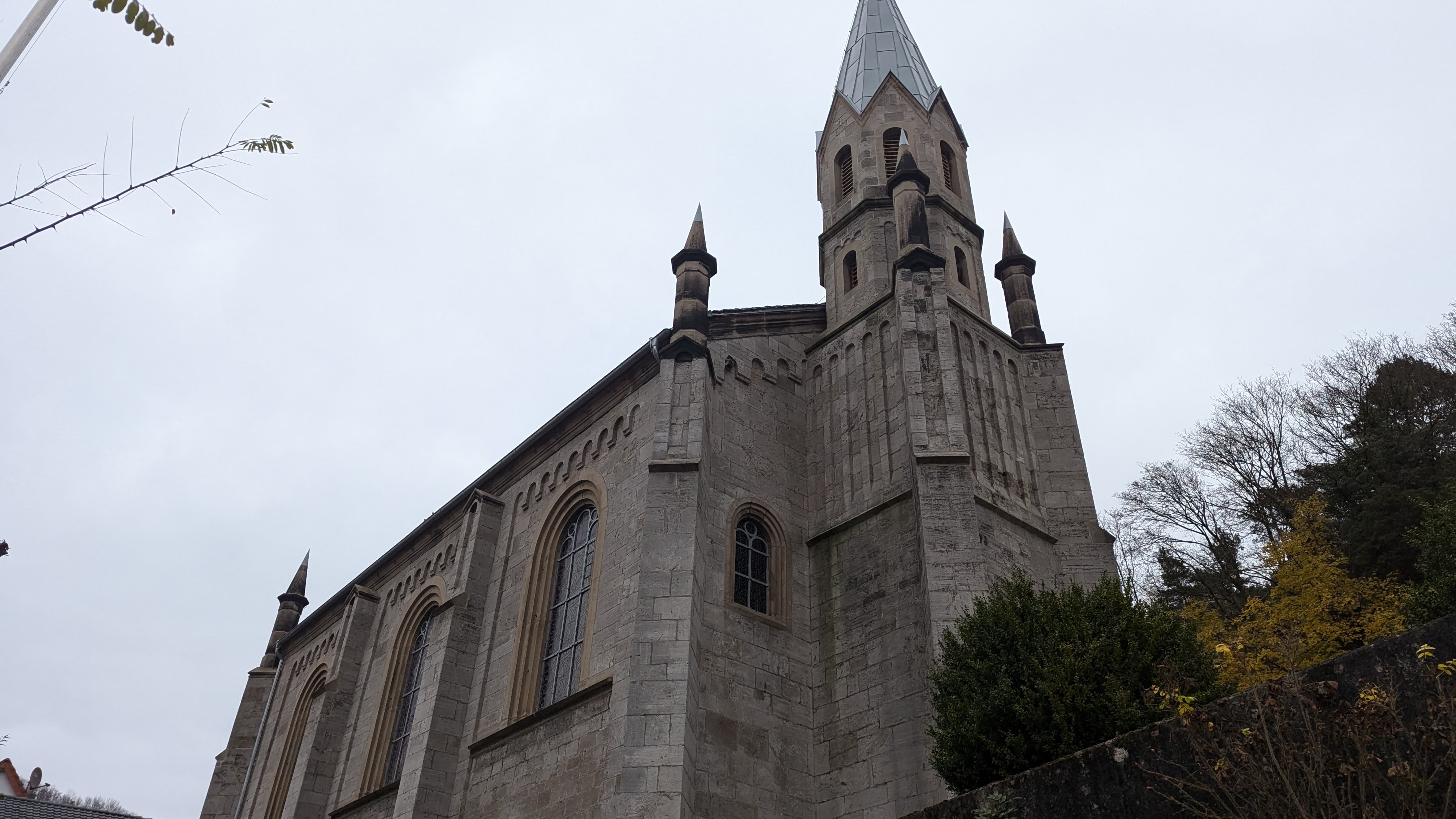 Erbaut 1864 steht die Kirche auf einem Berg "vor dem Tore". Besonders bemerkenswert sind die Buntglasfenster im Altarraum. Obwohl die Kirche im neoromanischen Stil gebaut ist, folgen die Bilder gotischer Tradition.